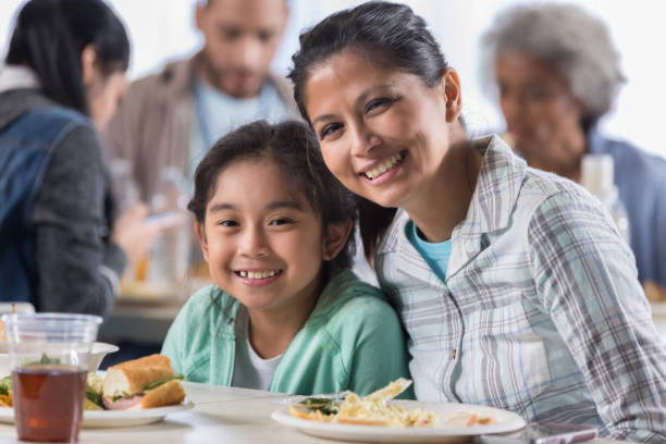 gettyimages-1016654950-612×612 ← Précédent Suivant → Mid adult woman and her elementary age daughter have lunch in a soup kitchen. People and volunteers are in the background.